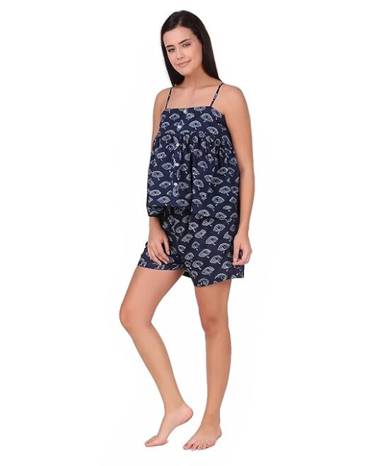 Soulful Threads Women Blue & White Spaghetti Top and Shorts Cotton Sleep Set