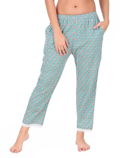 Soulful Threads Women Green Kantha Work Floral Printed Cotton Lounge Pant